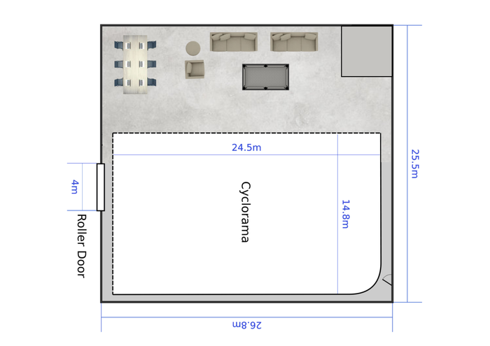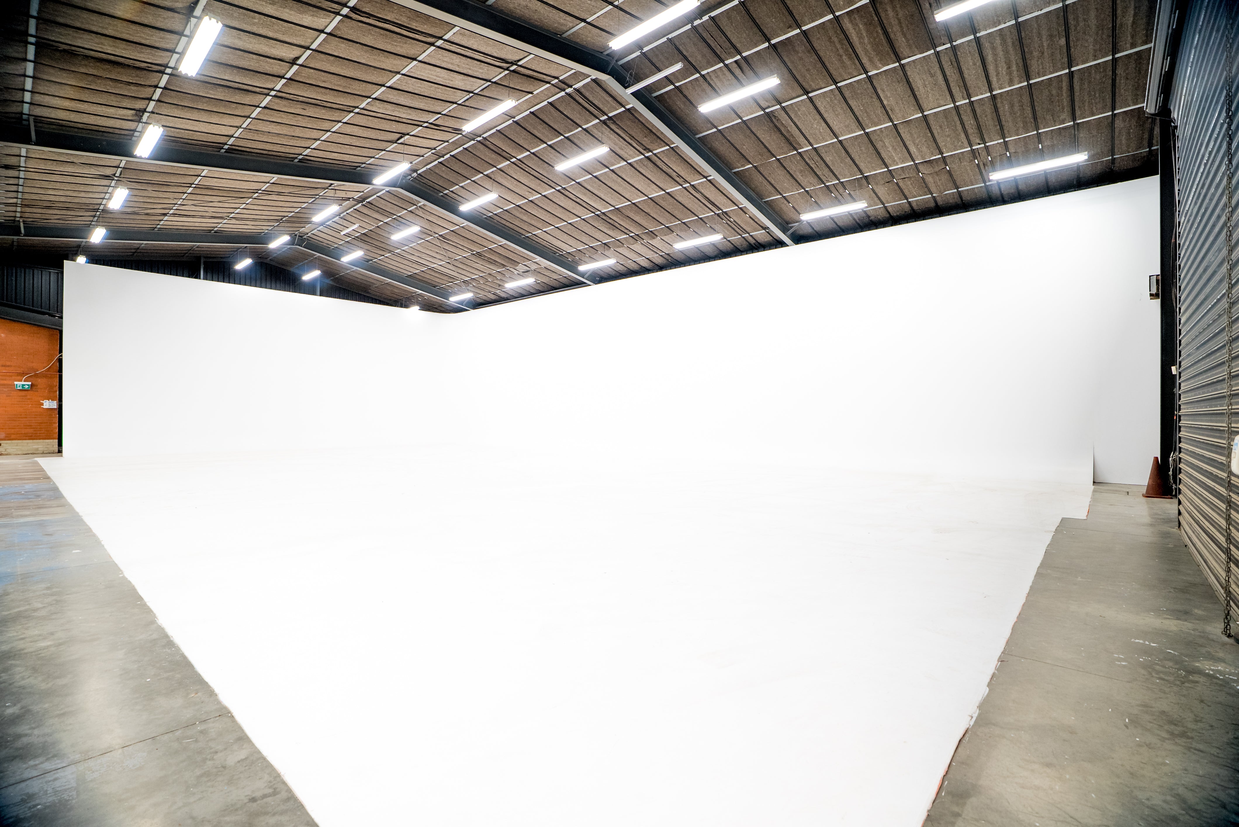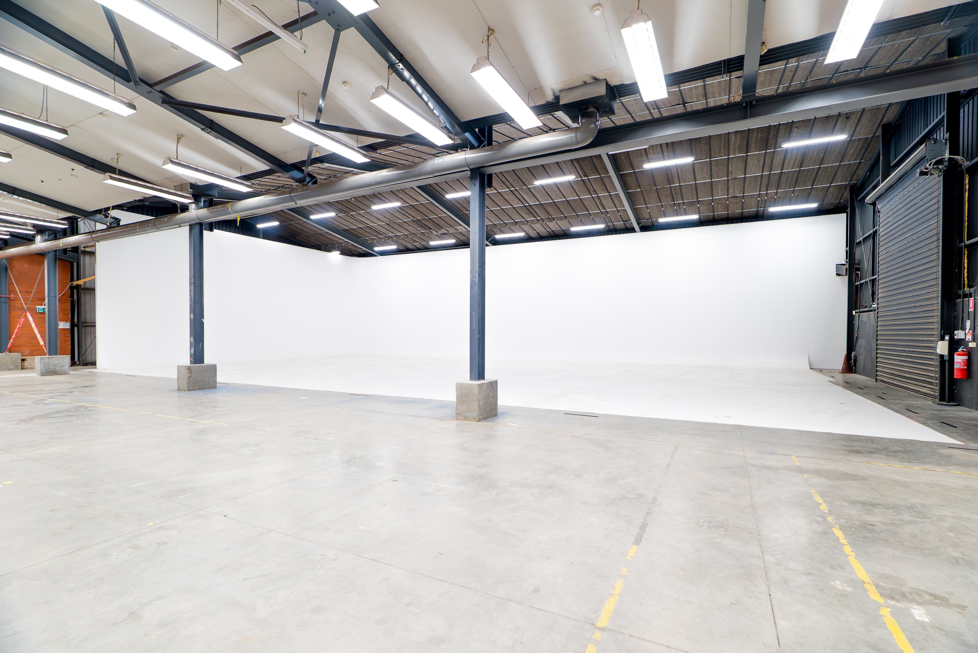 Studio 2 is a versatile 685 SQM space featuring a 26 × 14 m, 6 m-high, two-wall matt white cyclorama with roller door access. Fully blacked out with ceiling heat insulation and sound reduction, it includes 50 amp and 32 amp 3-phase power, an adjoining hair/makeup area, costume change rooms, and male, female, and disabled toilets - perfect for a variety of shoots in one convenient, fully equipped location.